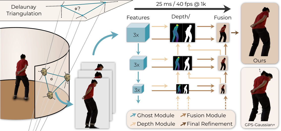 It combines geometric view selection via Delaunay triangulation (left) with depth-guided feedforward synthesis and coarse-to-fine refinement (center), enabling novel views from only three input cameras at 40 FPS (1k resolution) without per-scene retraining.